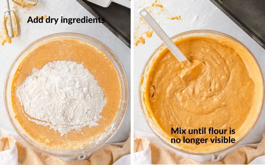 - Mix in pumpkin, oil, applesauce, and water on low so you don’t deflate the eggs.