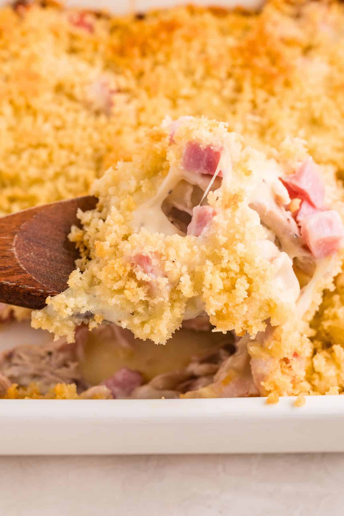 Chicken Cordon Bleu Casserole gives you all the creamy, savory flavor of the classic dish in a layered bake that's a simple weeknight dinner. This version uses a from-scratch Dijon-Parmesan sauce that comes together in just a few minutes on the stove, then it's layered with chicken and ham and finished with a crisp panko topping.